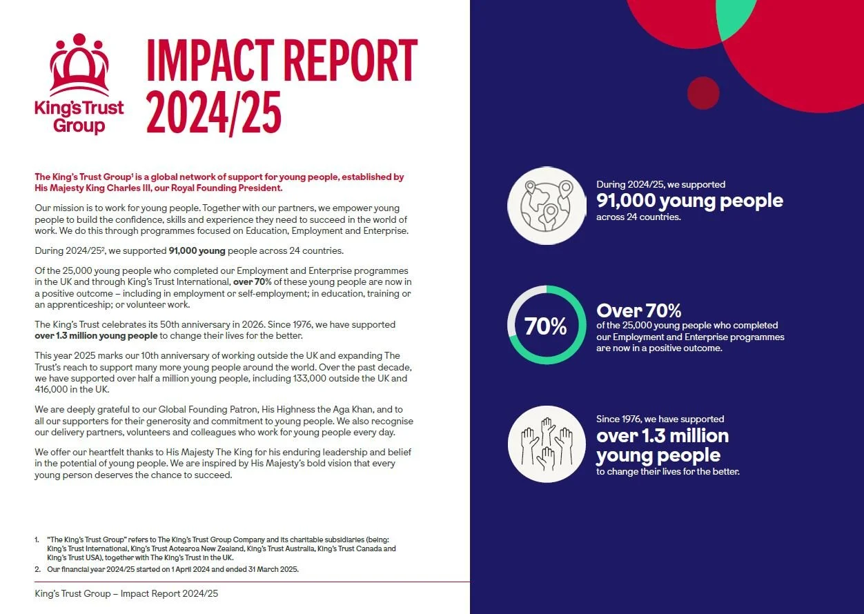 The King’s Trust Group is a global network of support for young people, inspired by the vision of our Royal Founding President, His Majesty King Charles III. Our mission is to work for young people, by empowering them to build the skills for a brighter future.